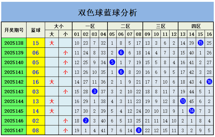 上期转头:双色球第2025147期开出奖号:红球01、03、05、08、22、33;蓝球08,其中红球三区比为4:1:1,开出1枚重号05,开出0组连号,蓝球开出二区号码08。